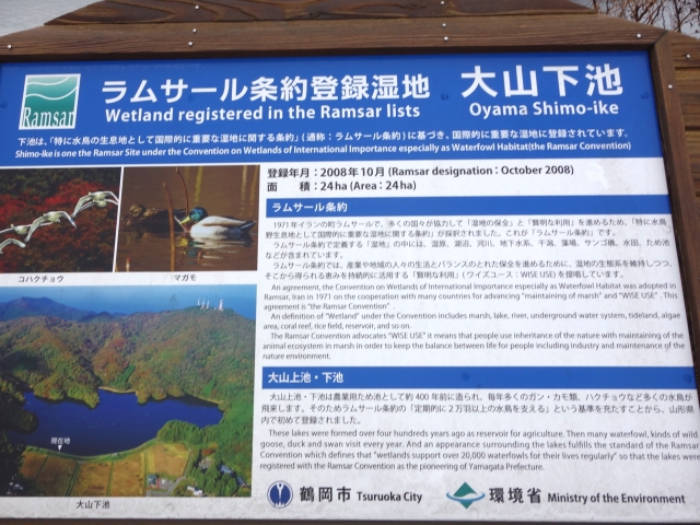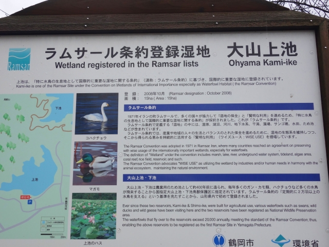 大山公園(尾浦城址、桜の名所)の南北にある大山上池・下池は、江戸時代に水害対策用・農業用のため池として造られたものです。現在はラムサール条約に登録された渡り鳥の飛来地となっています。